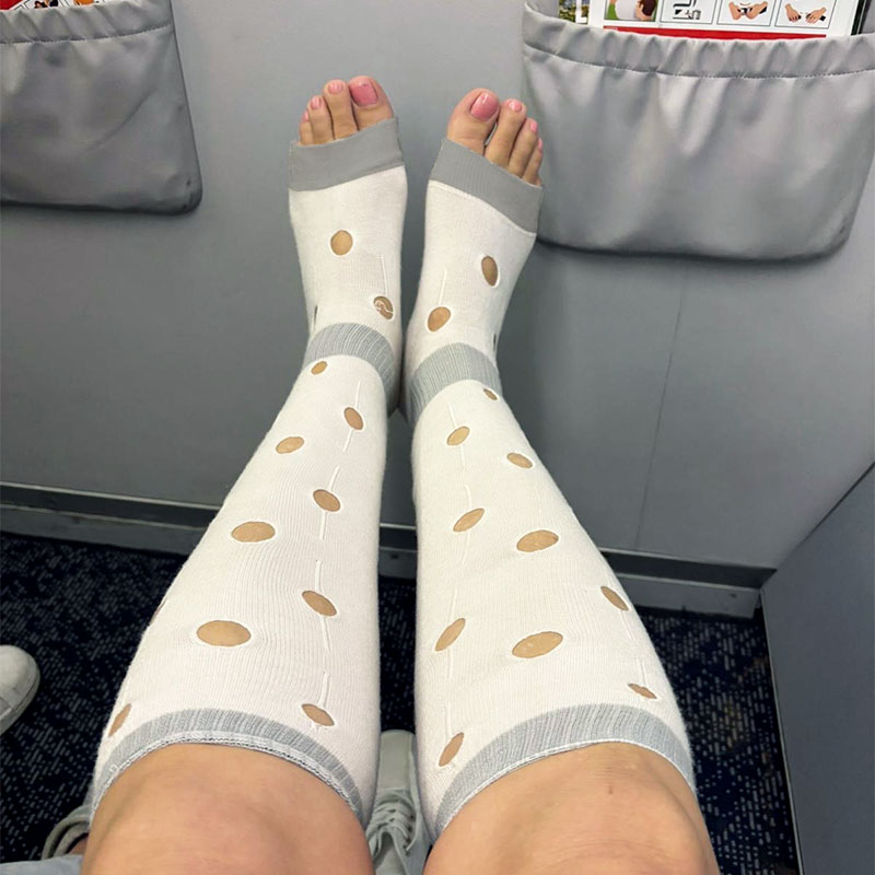 Our design focuses on all-day or all night wearability. Air-flow zones, strategically aligned with the body’s muscle structure from ankle to toe, help maintain circulation during long flights and extended sitting periods. This allows users to relax. No overheating, no tight bands, and no discomfort over time.